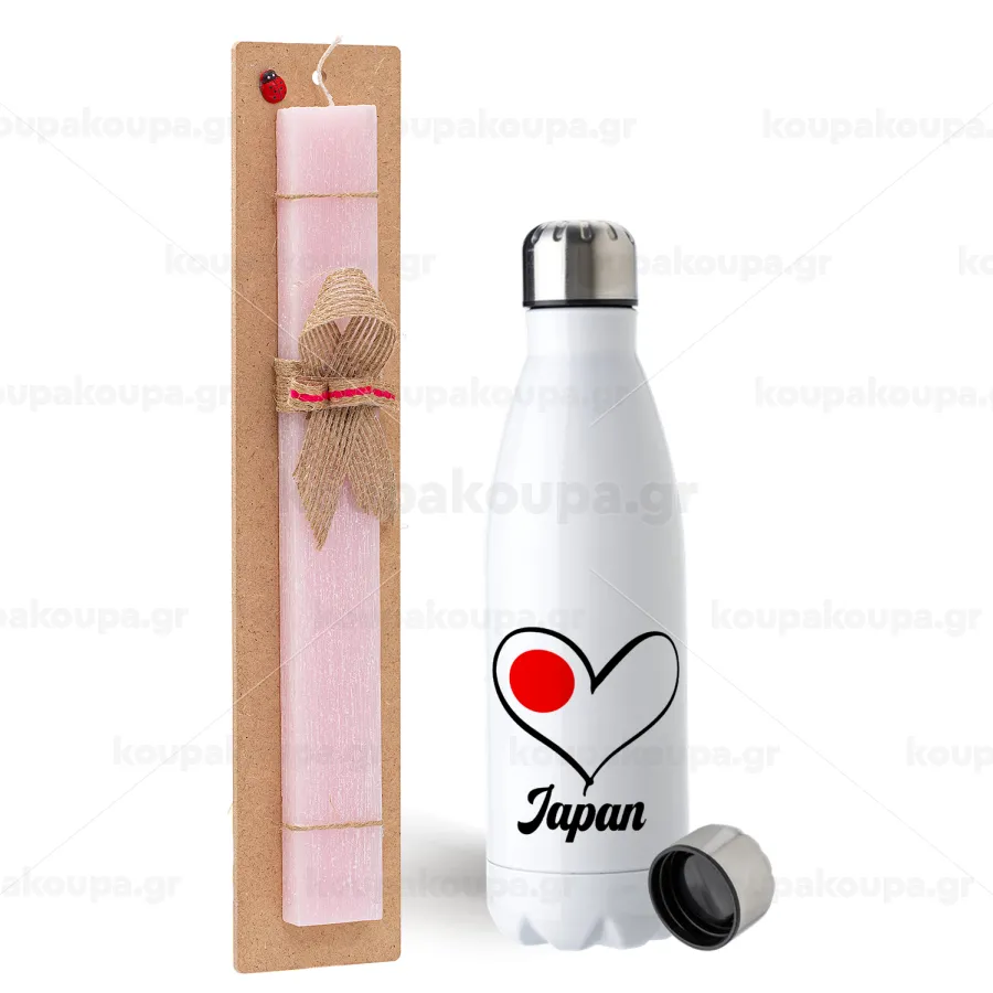 Japan flag, Easter Set, metallic stainless steel water bottle (750ml) & scented flat Easter candle (30cm) (PINK)