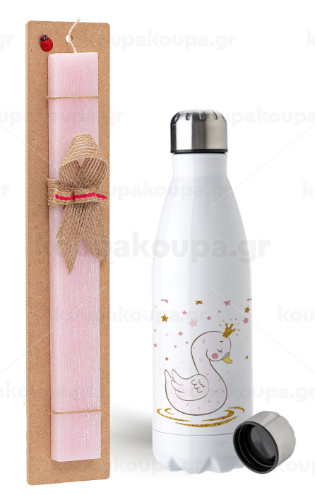 Crowned swan, Easter Set, metallic stainless steel water bottle (750ml) & scented flat Easter candle (30cm) (PINK)