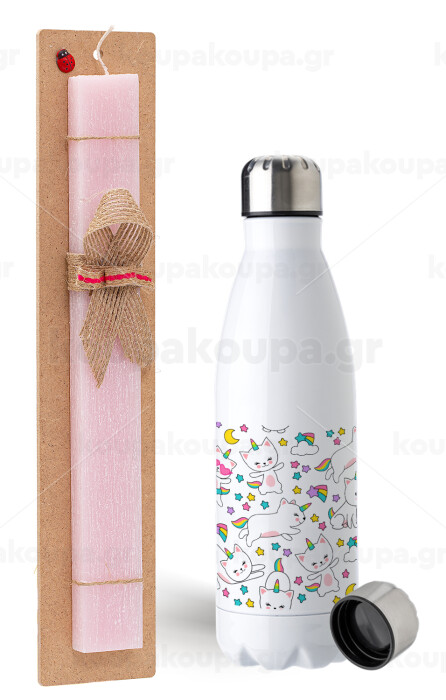 Cats unicorns, Easter Set, metallic stainless steel water bottle (750ml) & scented flat Easter candle (30cm) (PINK)