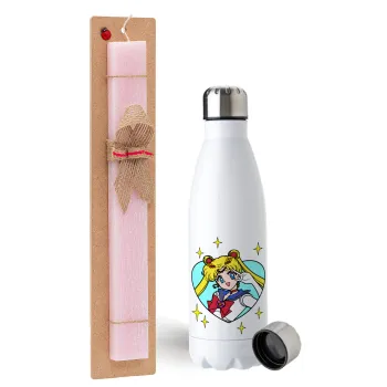 Sailor Moon star, Easter Set, metallic stainless steel water bottle (750ml) & scented flat Easter candle (30cm) (PINK)