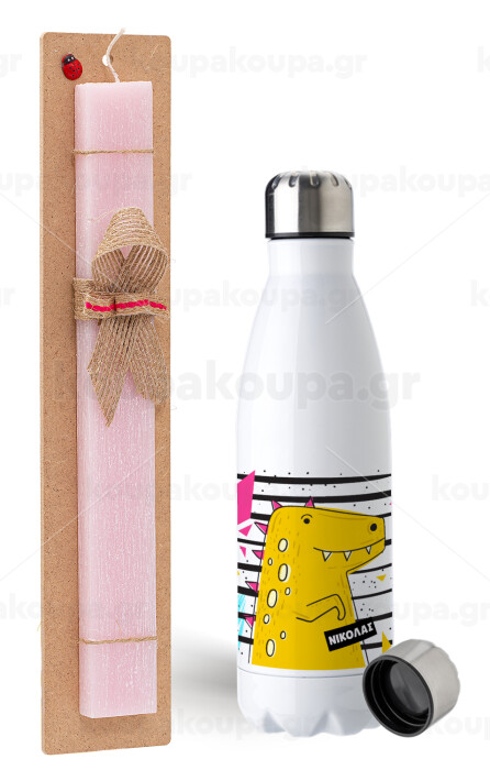 t-rex , Easter Set, metallic stainless steel water bottle (750ml) & scented flat Easter candle (30cm) (PINK)