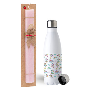 Unicorn pattern, Easter Set, metallic stainless steel water bottle (750ml) & scented flat Easter candle (30cm) (PINK)