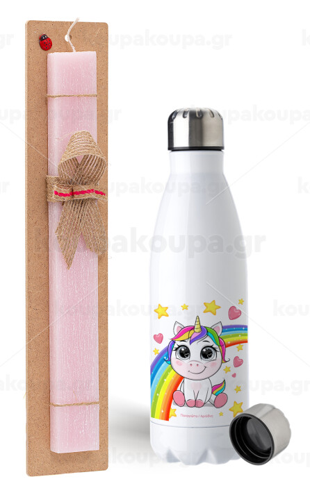 Unicorn baby με όνομα, Easter Set, metallic stainless steel water bottle (750ml) & scented flat Easter candle (30cm) (PINK)