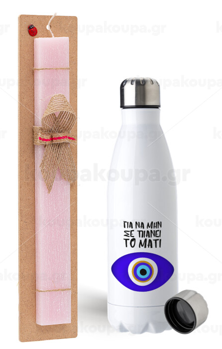 Για να μην σε πιάνει το μάτι, Easter Set, metallic stainless steel water bottle (750ml) & scented flat Easter candle (30cm) (PINK)