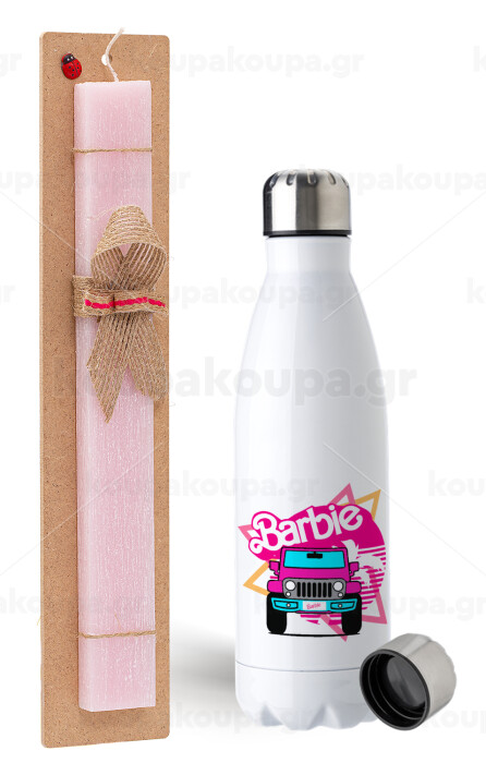Barbie car, Easter Set, metallic stainless steel water bottle (750ml) & scented flat Easter candle (30cm) (PINK)