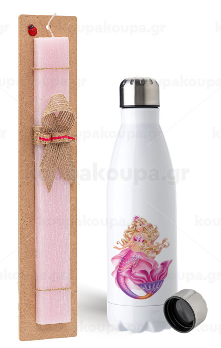Barbie mermaid blue, Easter Set, metallic stainless steel water bottle (750ml) & scented flat Easter candle (30cm) (PINK)