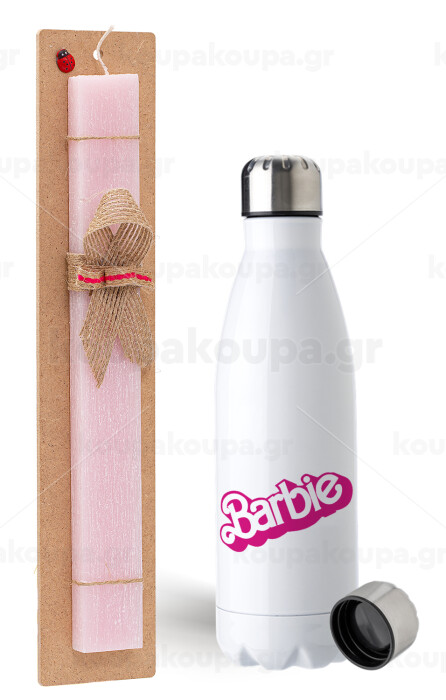 Barbie, Easter Set, metallic stainless steel water bottle (750ml) & scented flat Easter candle (30cm) (PINK)