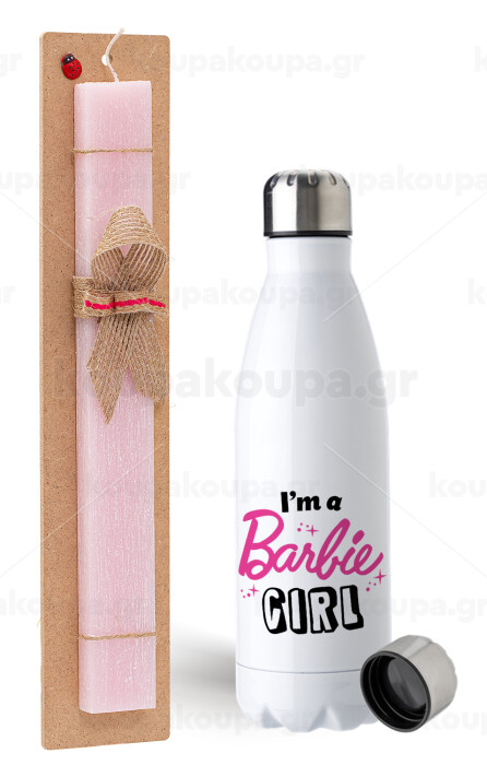 I'm Barbie girl, Easter Set, metallic stainless steel water bottle (750ml) & scented flat Easter candle (30cm) (PINK)