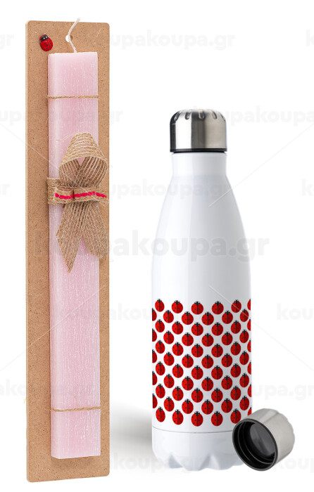 Coccinella, Easter Set, metallic stainless steel water bottle (750ml) & scented flat Easter candle (30cm) (PINK)