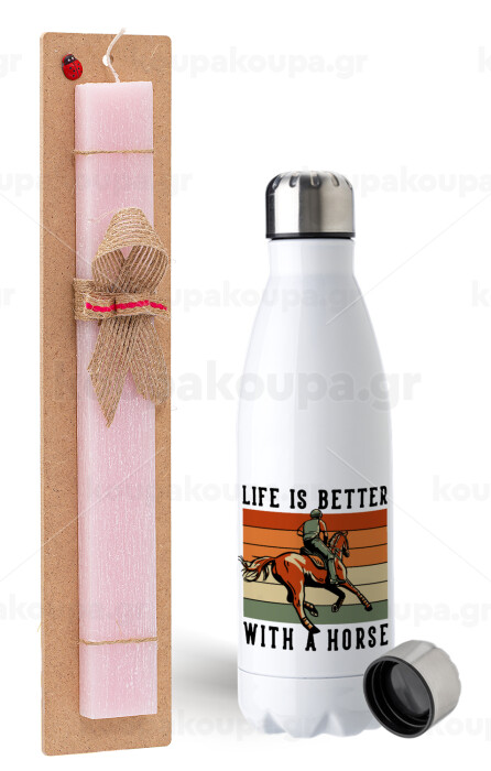 Life is Better with a Horse, Easter Set, metallic stainless steel water bottle (750ml) & scented flat Easter candle (30cm) (PINK)