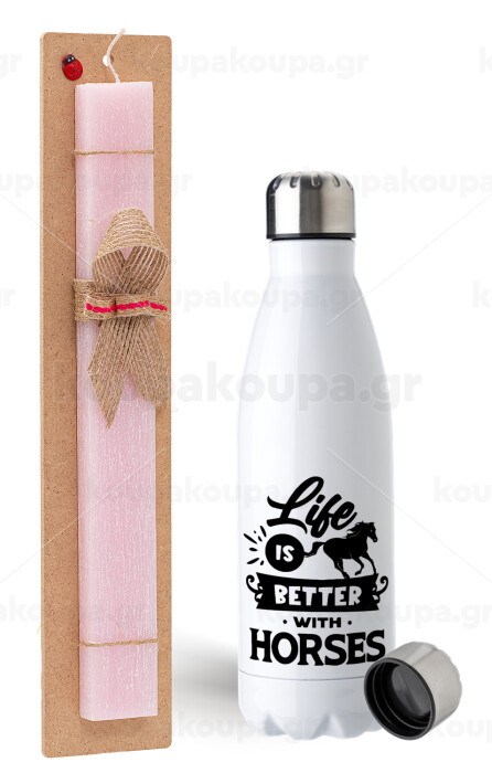 Life is Better with a Horses, Easter Set, metallic stainless steel water bottle (750ml) & scented flat Easter candle (30cm) (PINK)