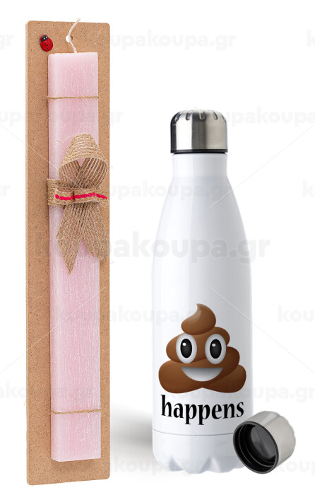 Shit Happens, Easter Set, metallic stainless steel water bottle (750ml) & scented flat Easter candle (30cm) (PINK)
