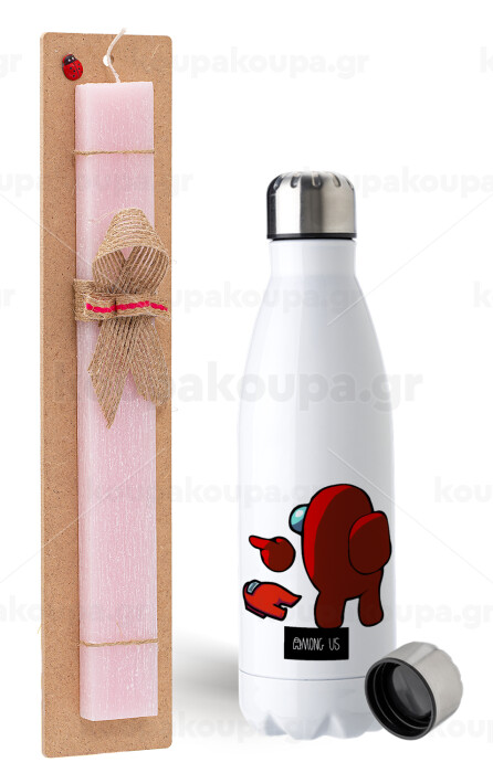 Among US i am impostor..., Easter Set, metallic stainless steel water bottle (750ml) & scented flat Easter candle (30cm) (PINK)