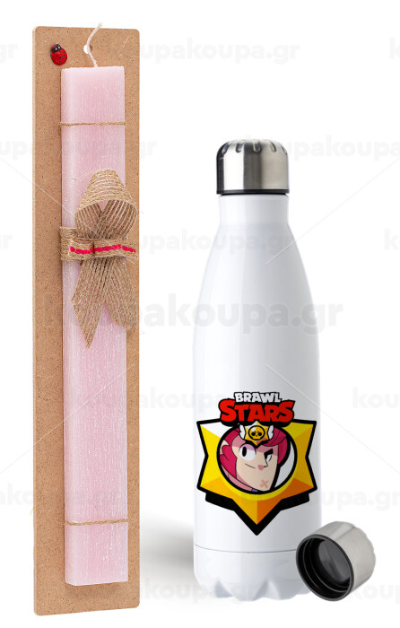 Brawl Stars Colt, Easter Set, metallic stainless steel water bottle (750ml) & scented flat Easter candle (30cm) (PINK)