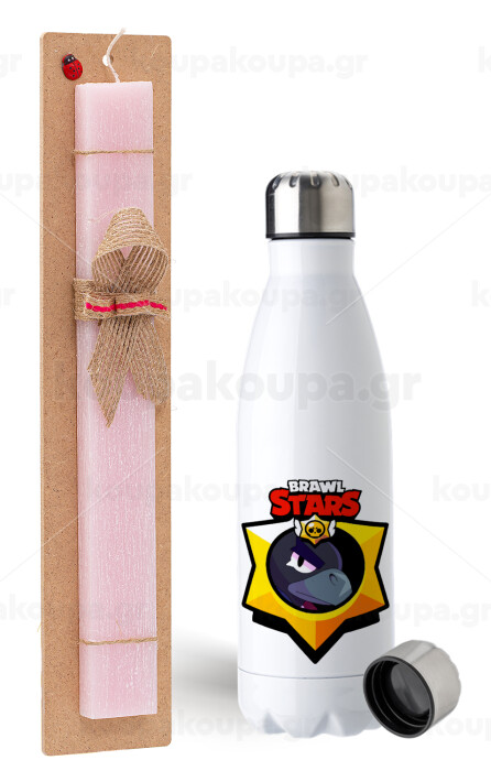 Brawl Stars Crow, Easter Set, metallic stainless steel water bottle (750ml) & scented flat Easter candle (30cm) (PINK)