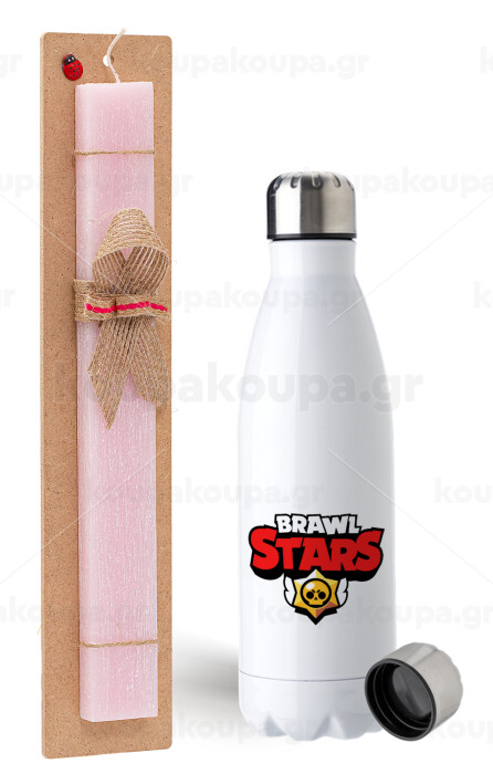 Brawl Stars, Easter Set, metallic stainless steel water bottle (750ml) & scented flat Easter candle (30cm) (PINK)