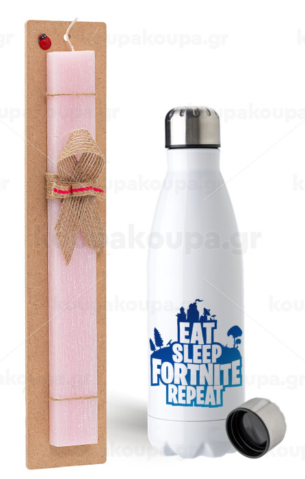Eat Sleep Fortnite Repeat, Easter Set, metallic stainless steel water bottle (750ml) & scented flat Easter candle (30cm) (PINK)