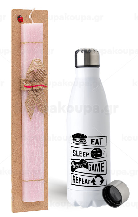 Eat Sleep Game Repeat, Easter Set, metallic stainless steel water bottle (750ml) & scented flat Easter candle (30cm) (PINK)
