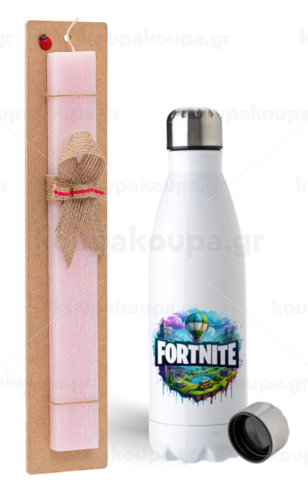 Fortnite land, Easter Set, metallic stainless steel water bottle (750ml) & scented flat Easter candle (30cm) (PINK)