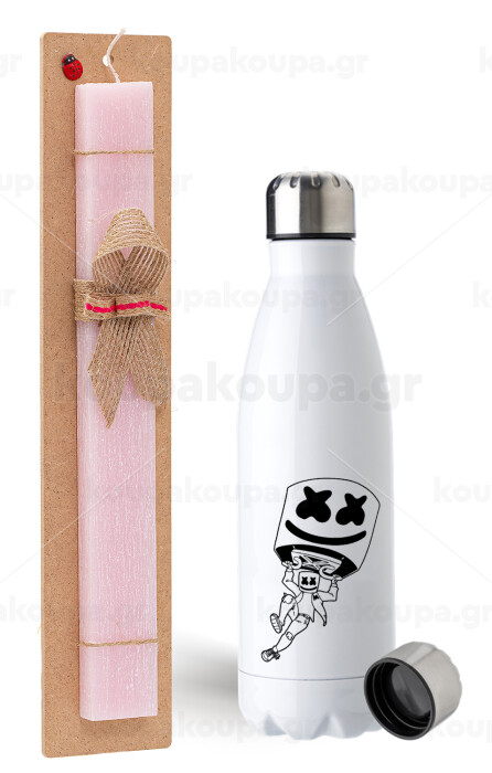 Fortnite Marshmello, Easter Set, metallic stainless steel water bottle (750ml) & scented flat Easter candle (30cm) (PINK)