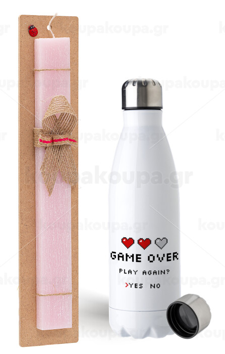 GAME OVER, Play again? YES - NO, Easter Set, metallic stainless steel water bottle (750ml) & scented flat Easter candle (30cm) (PINK)
