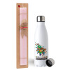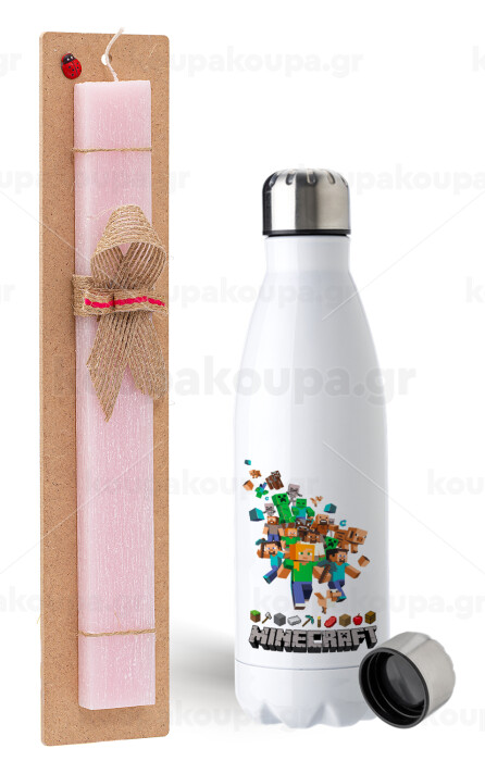 Minecraft adventure, Easter Set, metallic stainless steel water bottle (750ml) & scented flat Easter candle (30cm) (PINK)