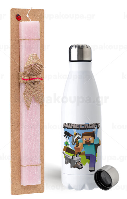 Minecraft Alex, Easter Set, metallic stainless steel water bottle (750ml) & scented flat Easter candle (30cm) (PINK)