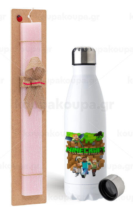 Minecraft characters, Easter Set, metallic stainless steel water bottle (750ml) & scented flat Easter candle (30cm) (PINK)