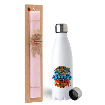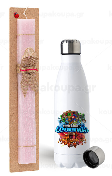 Minecraft legends, Easter Set, metallic stainless steel water bottle (750ml) & scented flat Easter candle (30cm) (PINK)