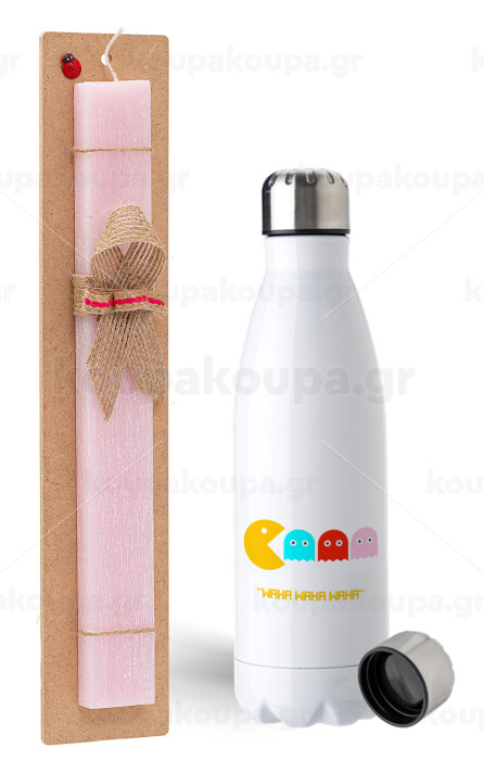 Pacman waka waka waka, Easter Set, metallic stainless steel water bottle (750ml) & scented flat Easter candle (30cm) (PINK)