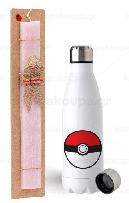 Pokemon ball, Easter Set, metallic stainless steel water bottle (750ml) & scented flat Easter candle (30cm) (PINK)
