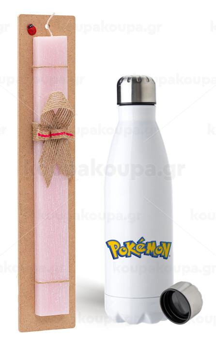 Pokemon, Easter Set, metallic stainless steel water bottle (750ml) & scented flat Easter candle (30cm) (PINK)