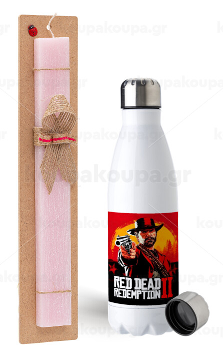 Red Dead Redemption 2, Easter Set, metallic stainless steel water bottle (750ml) & scented flat Easter candle (30cm) (PINK)