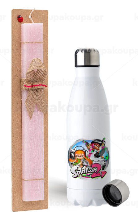 Splatoon 2, Easter Set, metallic stainless steel water bottle (750ml) & scented flat Easter candle (30cm) (PINK)