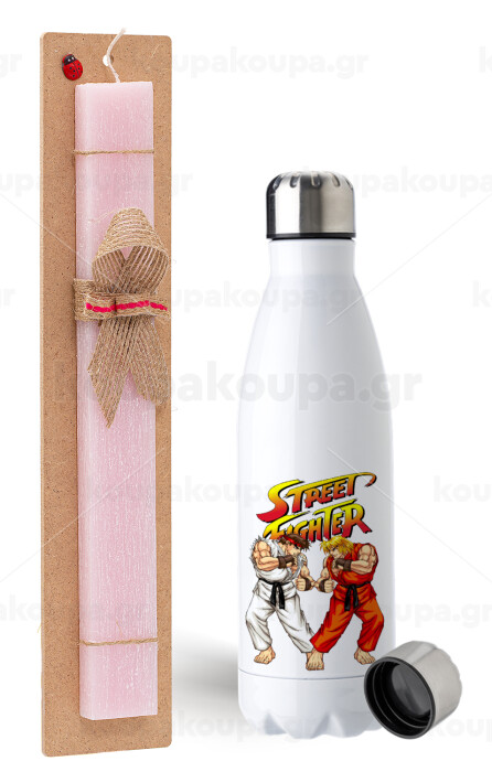 Street fighter, Easter Set, metallic stainless steel water bottle (750ml) & scented flat Easter candle (30cm) (PINK)