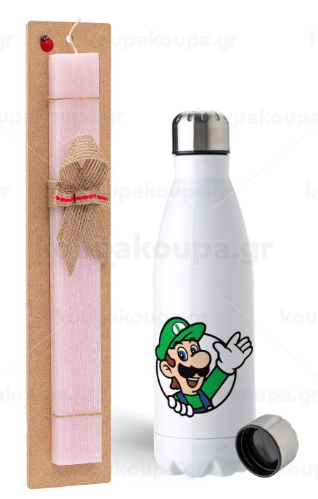 Super mario Luigi win, Easter Set, metallic stainless steel water bottle (750ml) & scented flat Easter candle (30cm) (PINK)