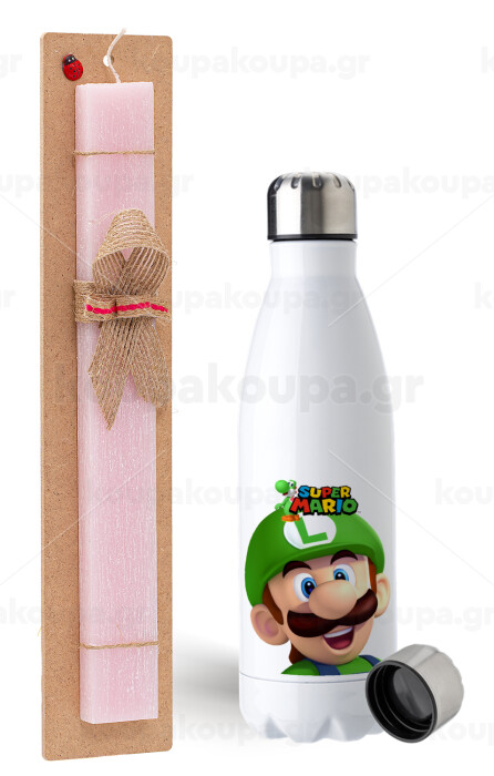 Super mario Luigi, Easter Set, metallic stainless steel water bottle (750ml) & scented flat Easter candle (30cm) (PINK)