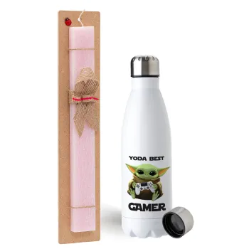 Yoda Best Gamer, Easter Set, metallic stainless steel water bottle (750ml) & scented flat Easter candle (30cm) (PINK)