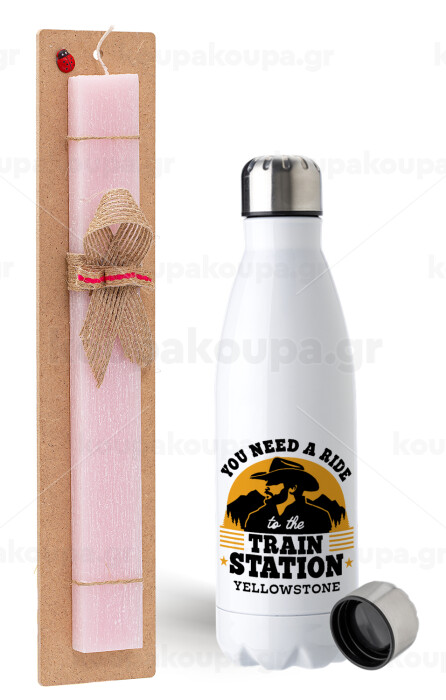 You need a ride to the train station, Easter Set, metallic stainless steel water bottle (750ml) & scented flat Easter candle (30cm) (PINK)