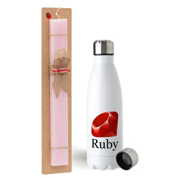 Ruby, Easter Set, metallic stainless steel water bottle (750ml) & scented flat Easter candle (30cm) (PINK)