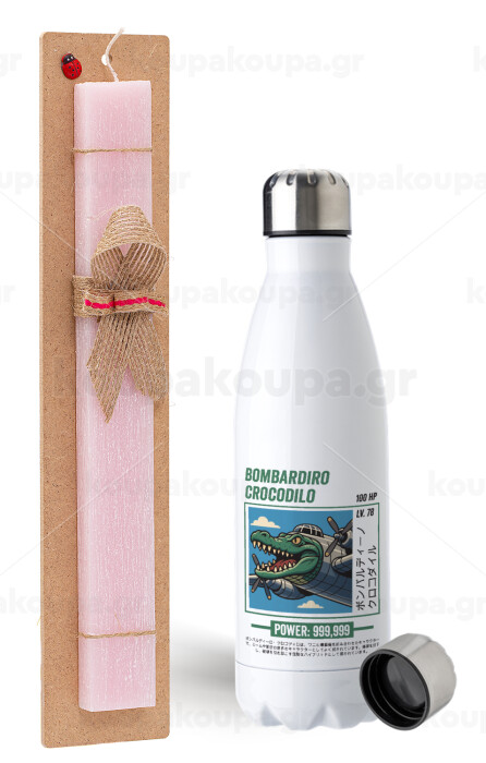Bombardiro Crocodilo, Easter Set, metallic stainless steel water bottle (750ml) & scented flat Easter candle (30cm) (PINK)