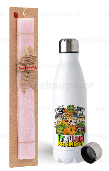 Italian Brainrot friends, Easter Set, metallic stainless steel water bottle (750ml) & scented flat Easter candle (30cm) (PINK)