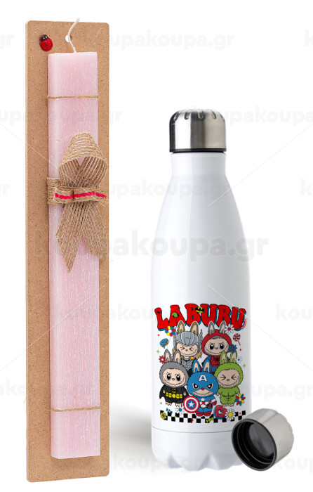 Labubu superheroes, Easter Set, metallic stainless steel water bottle (750ml) & scented flat Easter candle (30cm) (PINK)