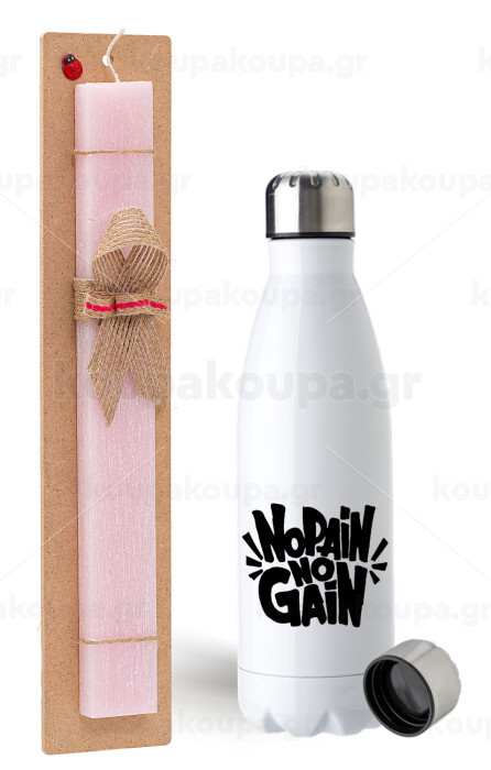 No pain no gain, Easter Set, metallic stainless steel water bottle (750ml) & scented flat Easter candle (30cm) (PINK)