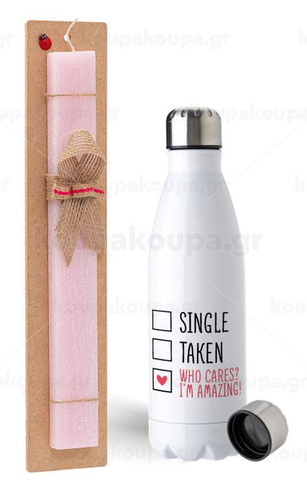 Single, Taken, Who cares i'm amazing, Easter Set, metallic stainless steel water bottle (750ml) & scented flat Easter candle (30cm) (PINK)
