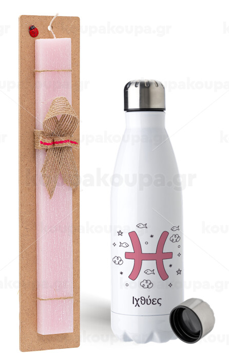 Ζώδια Ιχθύες, Easter Set, metallic stainless steel water bottle (750ml) & scented flat Easter candle (30cm) (PINK)