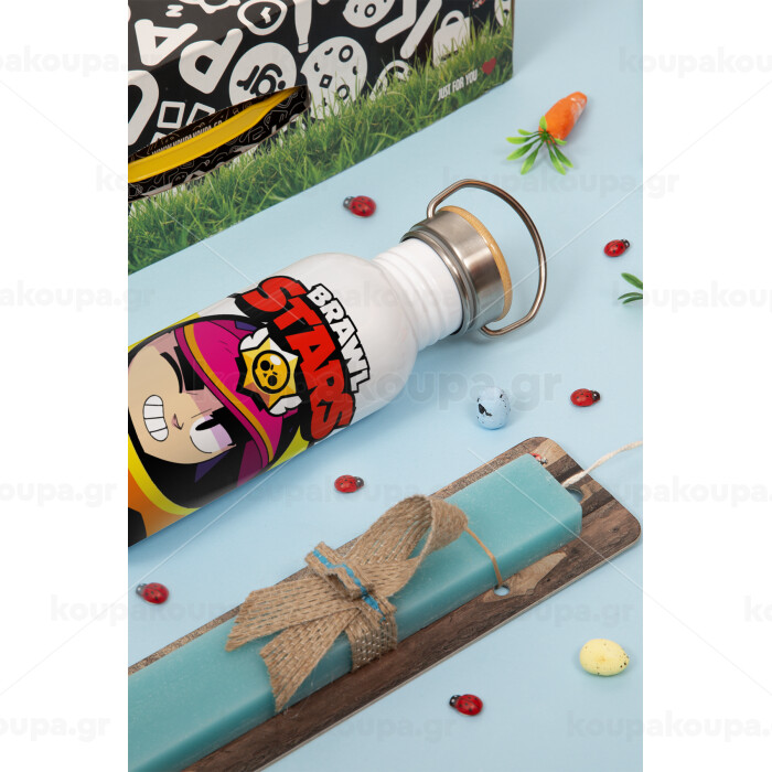 Brawl Stars Fang, Easter Set, metallic silver aluminum water bottle (500ml) & scented flat Easter candle (30cm) (TURQUOISE)