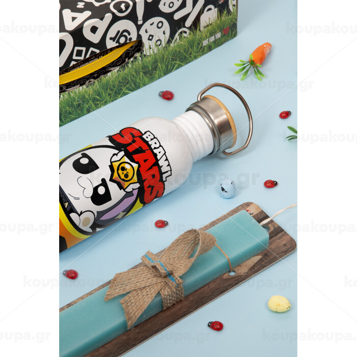 Brawl Stars Kit, Easter Set, metallic silver aluminum water bottle (500ml) & scented flat Easter candle (30cm) (TURQUOISE)