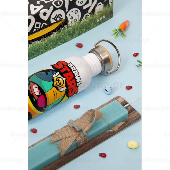 Brawl Stars Leon, Easter Set, metallic silver aluminum water bottle (500ml) & scented flat Easter candle (30cm) (TURQUOISE)