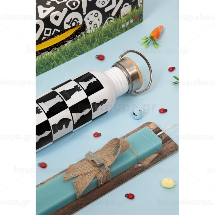 Chess set, Easter Set, metallic silver aluminum water bottle (500ml) & scented flat Easter candle (30cm) (TURQUOISE)